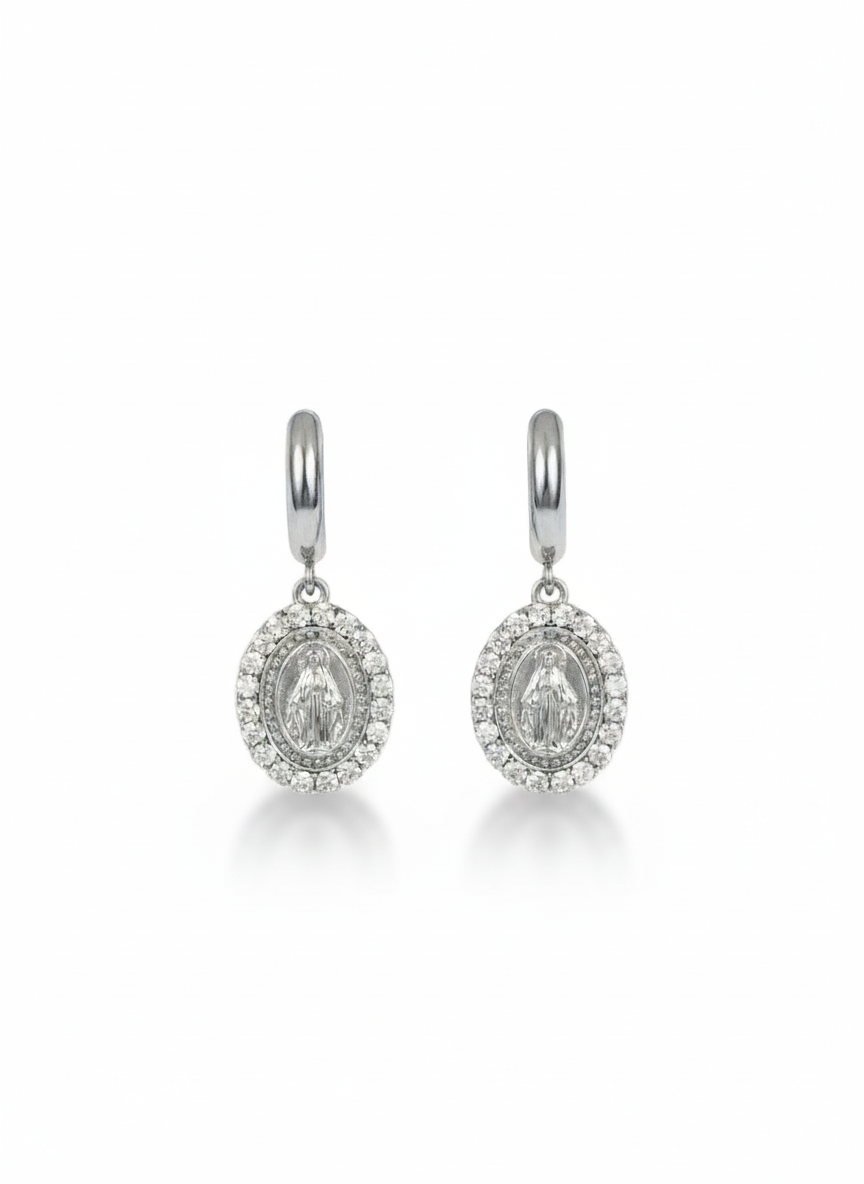 • Orecchini in acciaio inossidabile, cerchietto con ciondolo della madonnina pendente.