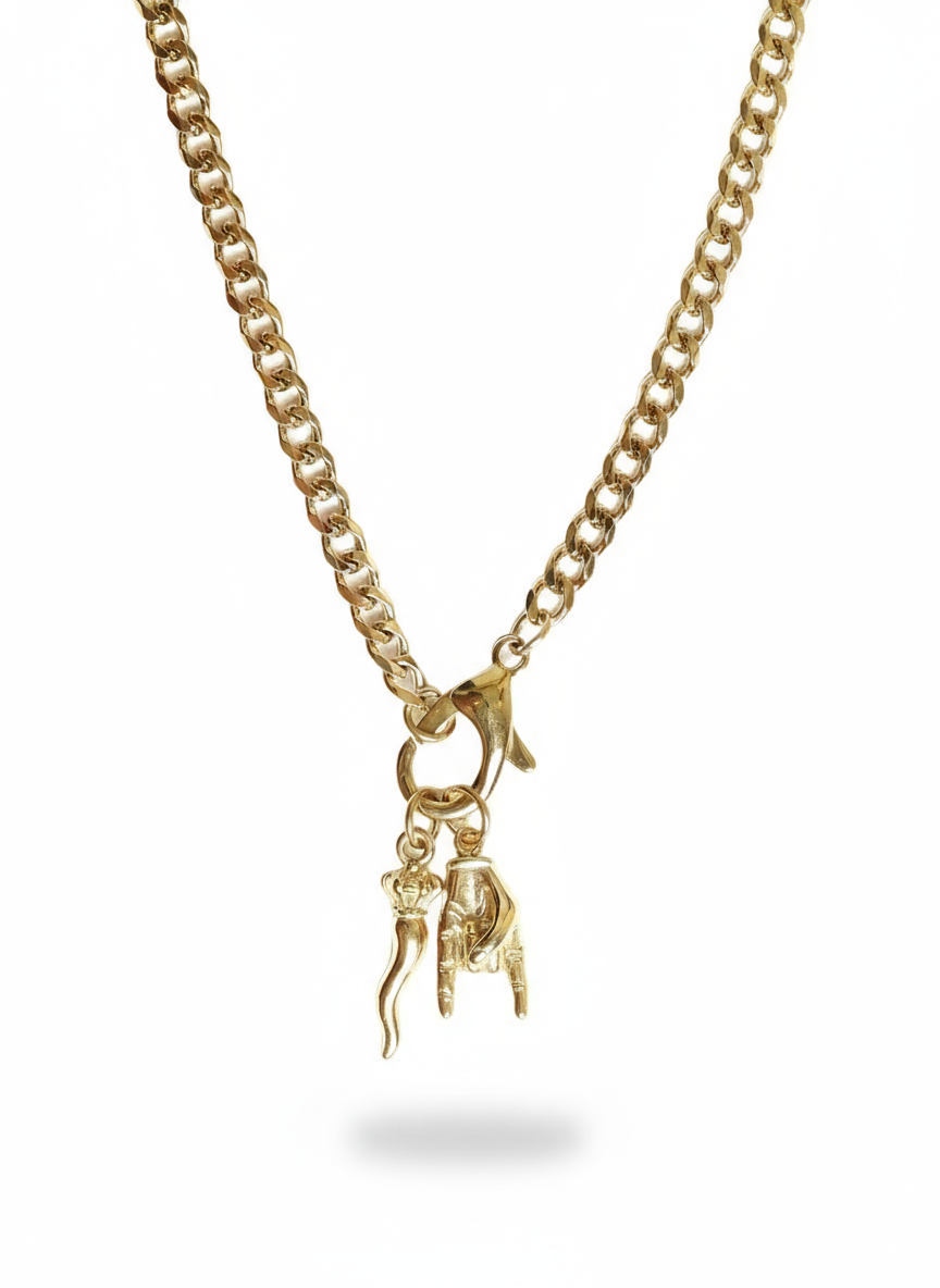 • Collana in acciaio inossidabile, maglia a catena con ciondoli scaramantici pendenti.