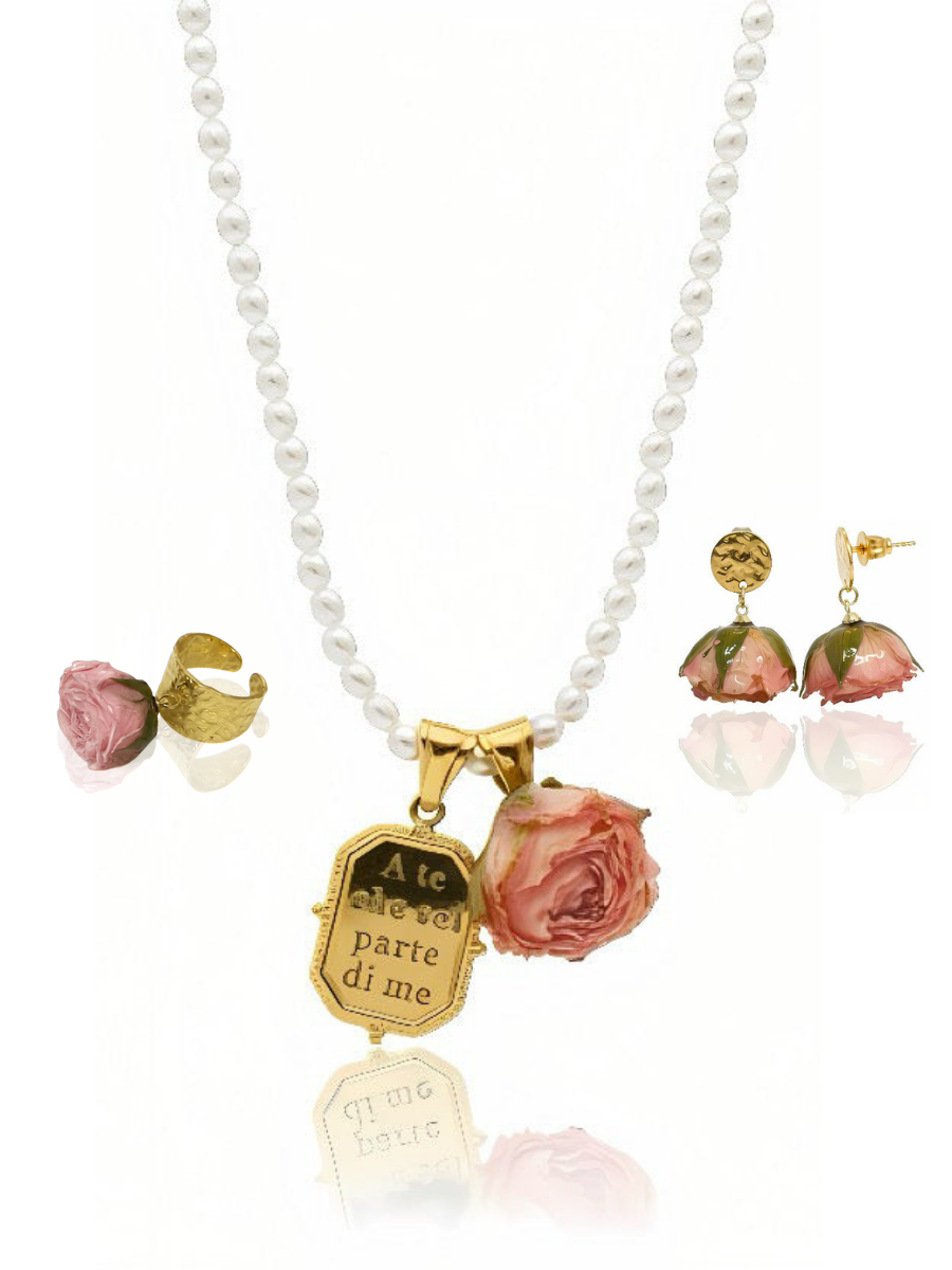 • Il Set Bianca comprende la collana personalizzata (puoi personalizzarla come vuoi nell'apposito campo in basso), l'anello e gli orecchini coordinati, realizzati in acciaio inossidabile con fiori di rosa veri essiccati e lavorati con resina.